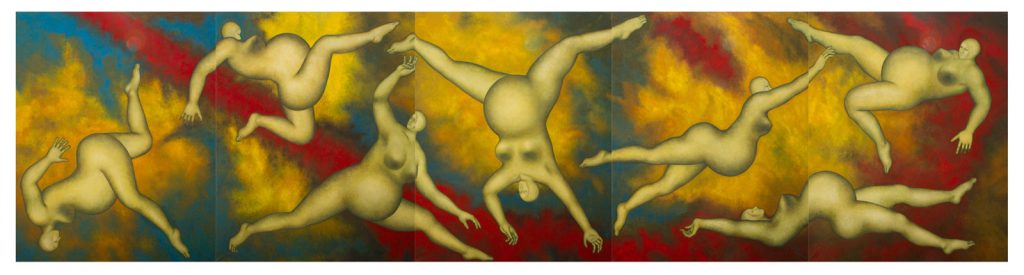 Le corps et l’univers se confondent. Fascinée par le corps humain et sa nudité, elle s’intéresse à toutes ses formes, de sa genèse première au processus de vieillissement. Chaque centimètre carré de ses silhouettes est un microcosme à part entière, vibrant de tension interne et de beauté solaire. Ses peintures de grand format fascinent par leur étrangeté décalée et dégagent une très contagieuse énergie.